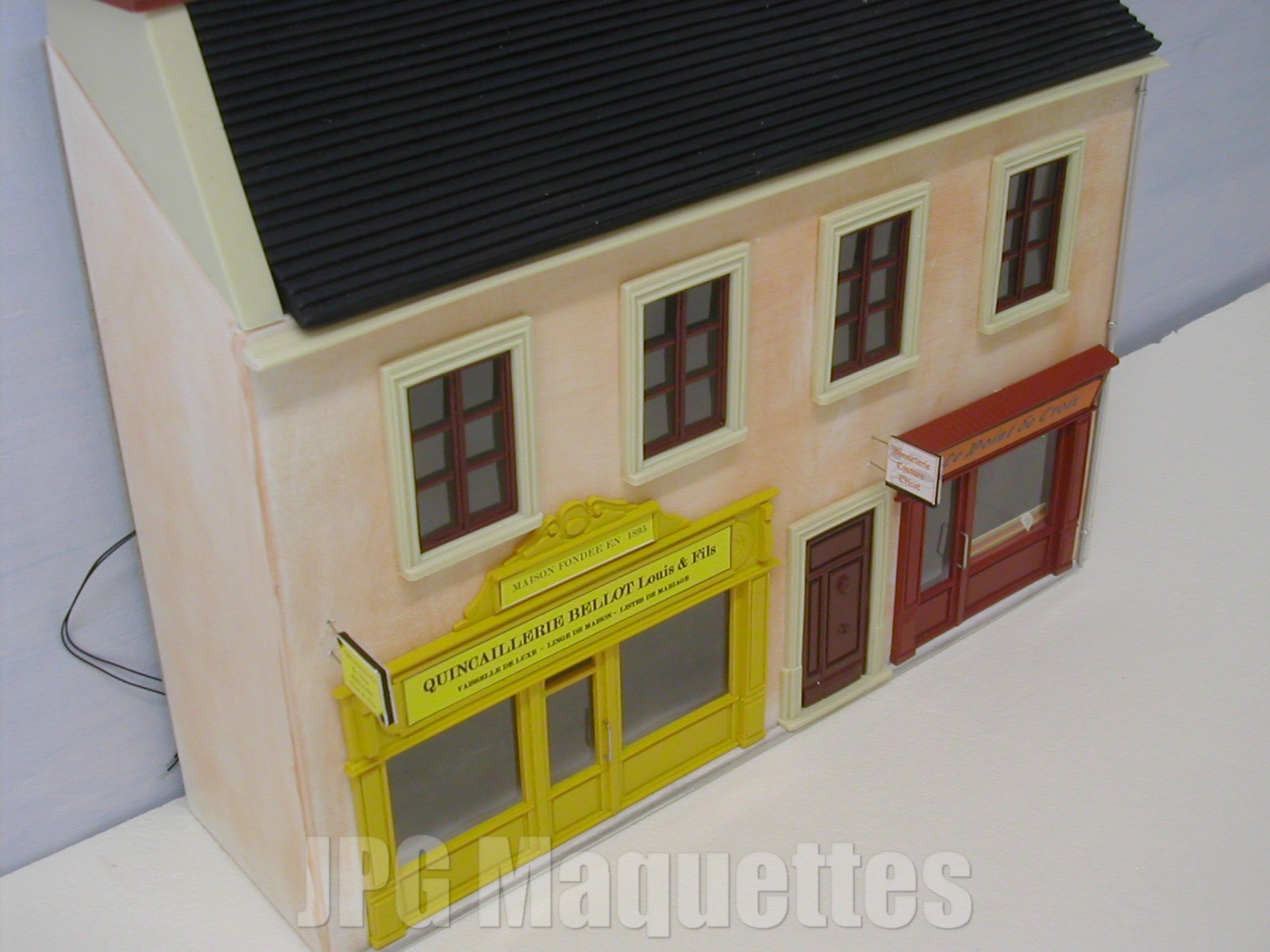 Bâtiment en PVC, toiture en plâtre, devantures commerces et huisseries en résine, livré avec une lampe 12 vcc.
