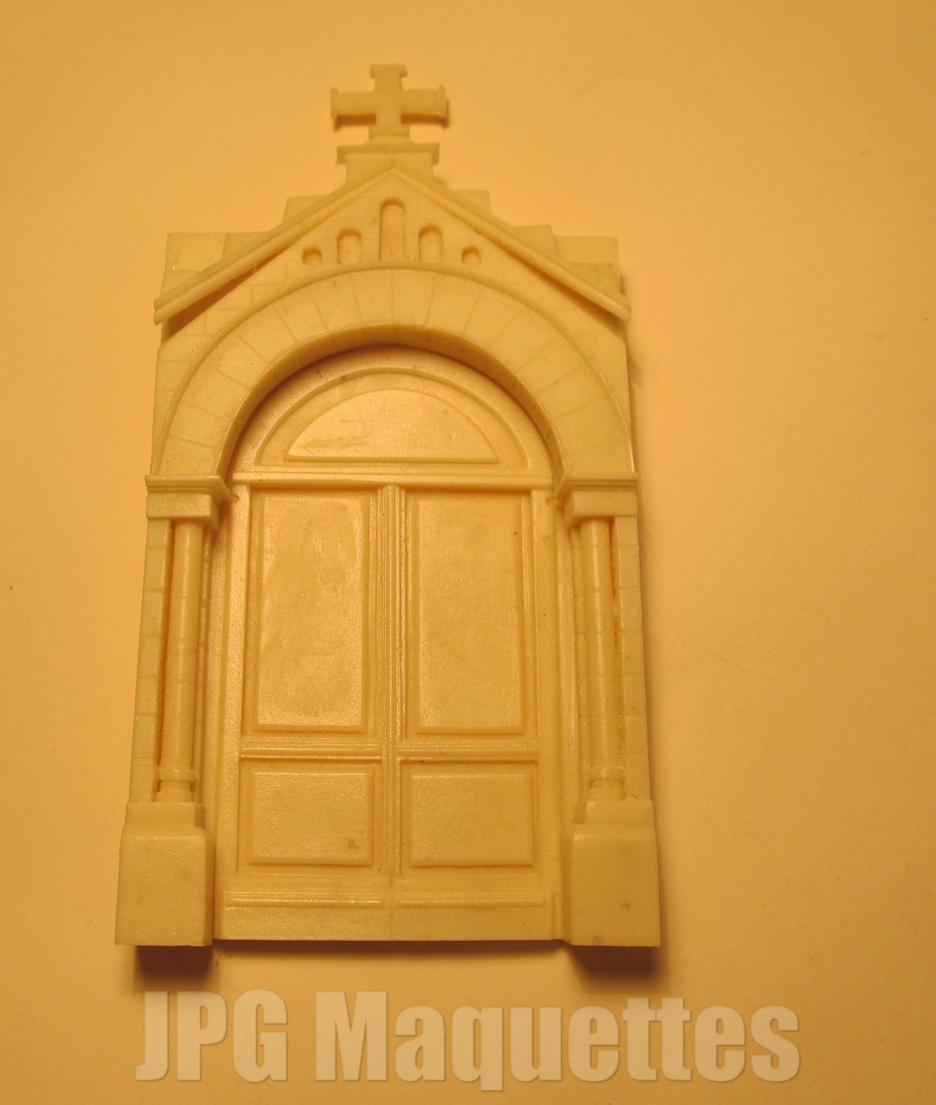 Entrée imitation pierre avec colonnes avec sa porte d'entrée "bois" et ornement avec sa croix