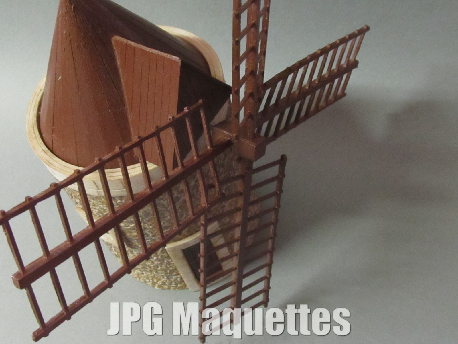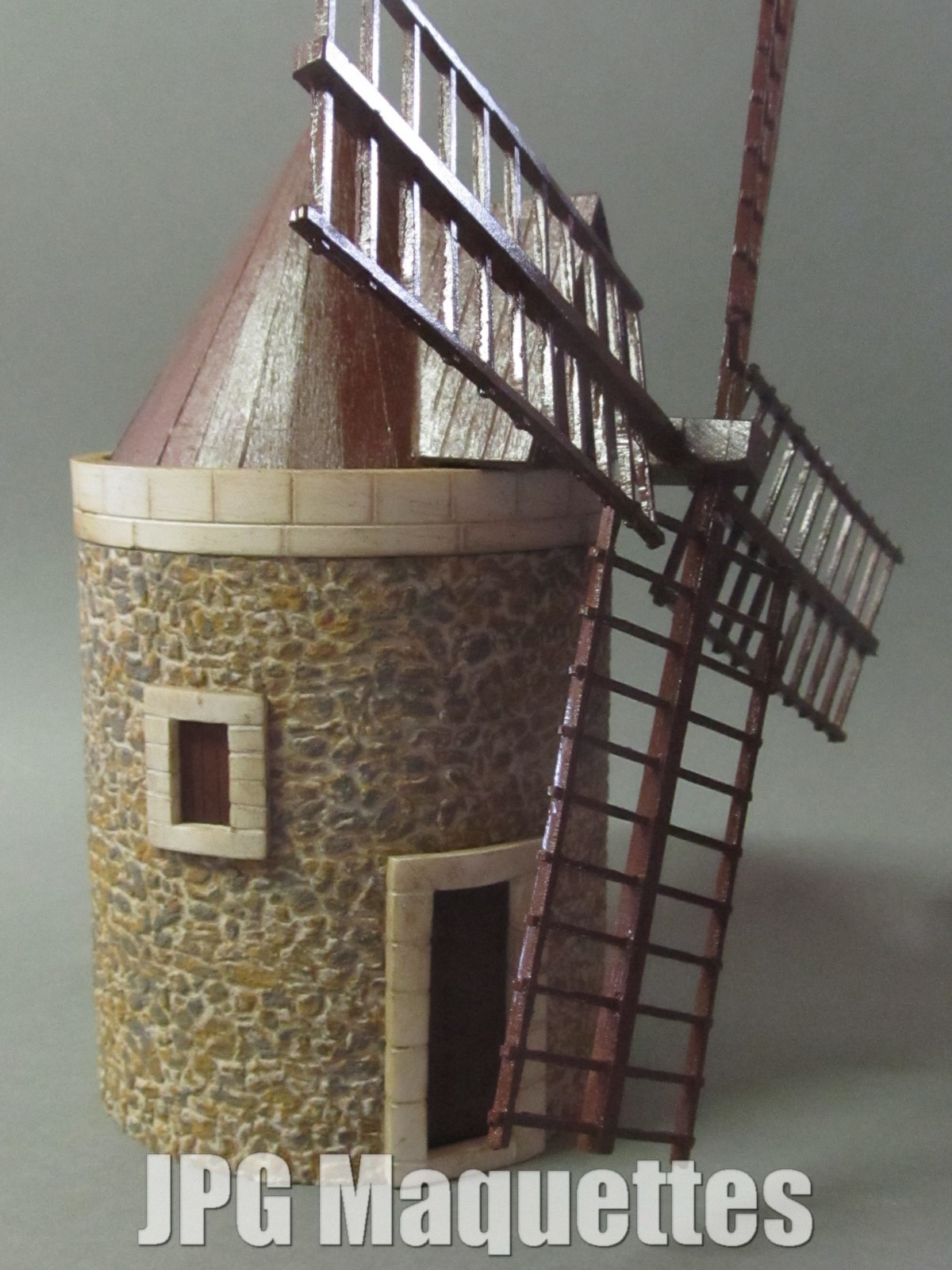 Sur cette version il y a un revêtement imitation pierres rustiques en relief de chez redutex référence 043PR122, ( passez la souris sur la photo du revêtement pour avoir la loupe )reste à peindre dans la teinte désirée la couronne supérieure, les huisseries et la toiture pour les kits et livrés dans la teinte de la photo dans les versions montées. ( dans les deux cas les piles sont fournies)A noter que dans ce cas le moulin fonctionne sous une tension de 3 V .